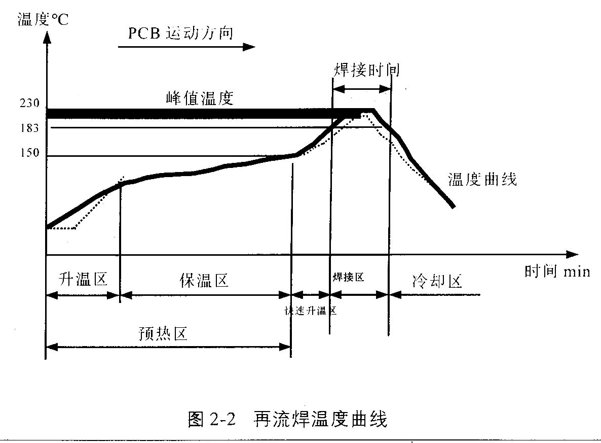 從溫度曲線(見圖2-2)分析再流焊的原理:當(dāng)PCB進入升溫區(qū)(干燥區(qū))時,焊膏中的溶劑、氣體蒸發(fā)掉,同時,焊膏中的助焊劑潤濕焊盤、元器件端頭和引腳,焊膏軟化、塌落、覆蓋了焊盤、元器件端頭和引腳與氧氣隔離→PCB進入保溫區(qū)時,PCB和元器件得到充分的預(yù)熱,以防PCB突然進入焊接高溫區(qū)而損壞PCB和元器件→當(dāng)PCB進入焊接區(qū)時,溫度迅速上升使焊膏達到熔化狀態(tài),液態(tài)焊錫對PCB的焊盤、元器件端頭和引腳潤濕、擴散、漫流或回流混合形成焊錫接點→PCB進入冷卻區(qū),使焊點凝固。此時完成了再流焊。