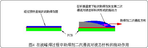 經(jīng)過預(yù)熱后的粘狀助焊劑與波峰釬料接觸后,活性劇增,粘度急劇下降而在被焊金屬表面形成第二次漫流,并迅速在被焊金屬表面鋪展開來。助焊劑第二次漫流過程所形成的漫流作用力,附加在液態(tài)釬料上從拖動了液態(tài)金屬的漫流過程,如圖4所示。